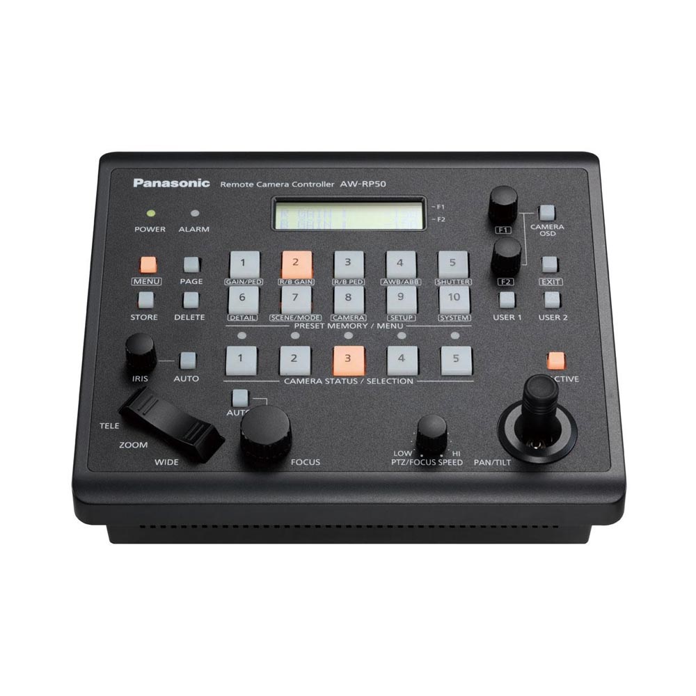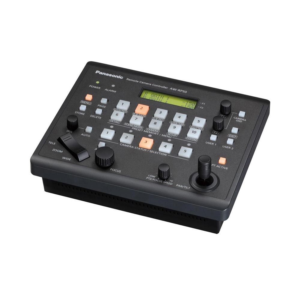 The Panasonic AW-RP50 is a compact remote controller for Pan/Tilt/Zoom (PTZ) cameras. It is simple to connect and operate, with both IP and Serial control functions. The AW-RP50 is compatible with the Panasonic AW-HE120 and AW-HE130 HD PTZ Cameras and can be connected by either Serial or IP.