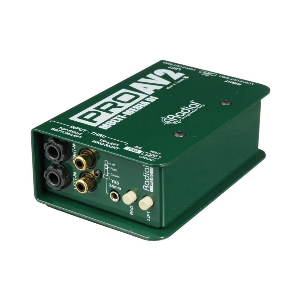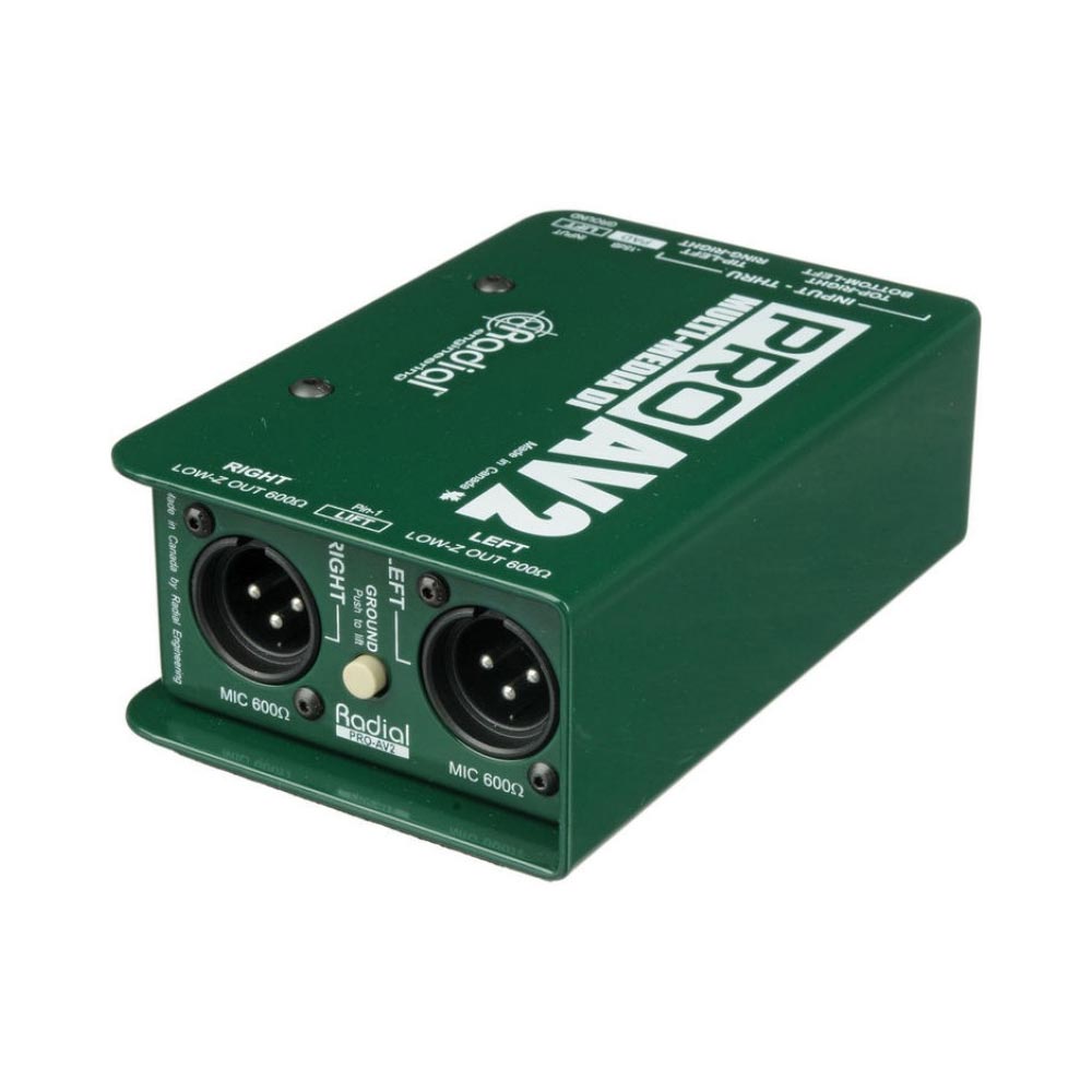 The Radial ProAV2 is apassive direct boxes specifically developed with the audio-video integrator in mind. The ProAV1 features a variety of stereo inputs that are summed mono via a resistive mixer, greatly simplifying signal management. The ProAV2 delivers two discrete channels where full stereo functionality is required.