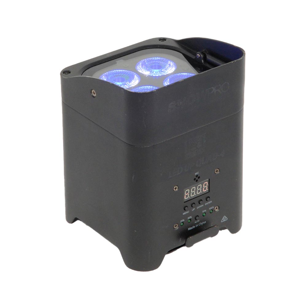 The ShowPRO LED UP Quad-4 is a compact, light-weight and easy to use battery uplight. Equipped with 4 bright 10W RGBW LEDs, a Lithium-ion battery and wireless control it has an approximate runtime of 12 hours on a single colour from full charge.